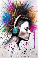 Dit is een digitale kunstafbeelding van het hoofd van een vrouw met een koptelefoon op. De achtergrond is wit met spatten van kleurrijke verf. De koptelefoon is bruin. De afbeelding heeft een surrealistische en artistieke uitstraling.
