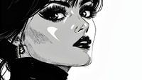 Deze elegante zwart-wit illustratie toont een mooie vrouw met lang donker haar en donkere lippenstift die poseert voor een schoonheidsportret. Het contrastrijke beeld benadrukt haar natuurlijke schoonheid en mysterieuze uitdrukking, terwijl de fijne lijnen het portret bijzonder expressief maken.
