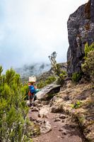 Vrouw met mand op haar hoofd in Tanzania die de Kilimanjaro berg op klimt tussen de planten en stenen door.