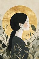 Deze prachtige illustratie combineert een minimalistische stijl met natuurlijke elementen en subtiele kleuren. Een serene vrouw, omringd door delicate planten, staat centraal tegen een gouden cirkel die doet denken aan de zon. De strakke lijnen en zachte tinten maken dit ontwerp perfect voor moderne interieurs. Voeg een vleugje rust en elegantie toe aan elke ruimte met deze unieke illustratie die balans en eenvoud uitstraalt. Ideaal voor liefhebbers van minimalistische kunst en natuur.