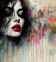 Een sensuele vrouw met rode lippen en donker nat haar, en een met graffiti, inkt en verf besmeurde krant. De combinatie van deze onderwerpen heeft een sexy uitstraling, laat je fantasie de vrije loop. Het beeld is met behulp van ai gegenereerd.