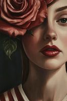 Een krachtige, vrouwelijke portretstudie met een moderne klassieke uitstraling. Deze close-up toont de mysterieuze schoonheid van een vrouw, deels bedekt door een diepe rode roos. Haar volle lippen en zachte huidtonen contrasteren met de donkere achtergrond en de rijke textuur van het bloemblad. De penseelstreken en het lichtspel geven…
