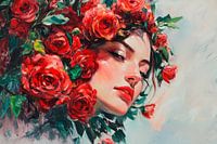 Gehuld in helderrode rozen straalt een indrukwekkende schoonheid met zachte gelaatstrekken en diepe, dromerige blikken. De harmonieuze combinatie van flora en menselijke gratie voegt levendige energie toe aan elke kamer. Dit kunstwerk is ideaal voor de woonkamer, creëert een uitnodigende sfeer en inspireert tot een gesprek.