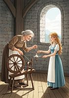 Illustratie toont een oudere vrouw met grijs haar en een jonge vrouw met blond haar bij een spinnewiel in een stenen kamer met een boograam.