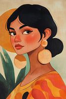 Dit levendige portret straalt kleur en elegantie uit. Een vrouw met een zelfverzekerde blik draagt opvallende, ronde oorbellen die het geheel een unieke uitstraling geven. De warme tinten van oranje en geel benadrukken haar krachtige aanwezigheid, terwijl de subtiele groene en beige accenten in de achtergrond een harmonieuze balans bieden. Dit ontwerp is perfect voor moderne interieurs en zal zeker een blikvanger zijn in elke kamer. Het combineert stijl en artistieke flair, met een vleugje mysterie. Een prachtig kunstwerk dat een unieke sfeer creëert, ideaal voor ruimtes zoals kantoren of slaapkamers.