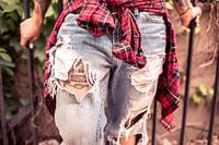 Deze foto toont een persoon in een casual en ruige outfit. De aandacht wordt getrokken naar een versleten en gescheurde spijkerbroek, met grote scheuren bij de knieën en dijen. Door een van de scheuren is een opvallende tatoeage zichtbaar: een schedel met decoratieve details, die een rebelse en stoere uitstraling geeft.