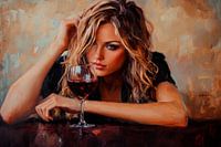 In een zacht spel van licht en schaduw vangt de scène de melancholie van een mysterieus moment. De vrouw, met haar verleidelijke blik en weelderige krullen, lijkt in gedachten verzonken terwijl ze elegant een glas rode wijn vasthoudt. Haar uitdrukking straalt zowel kracht als kwetsbaarheid uit, alsof ze een verhaal vertelt dat alleen zij kent.