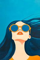 Een elegante vrouw met gedurfd, wapperend haar en een opvallende oranje zonnebril komt op in helder blauw en straalt pure zomergeest en vrijheid uit. Haar nonchalante houding en het levendige kleurcontrast voegen een vleugje frisheid toe aan elke kamer. Ideaal voor in de woonkamer, waar ze gesprekken en een goed humeur stimuleert.