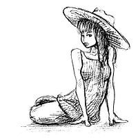 Vrouw met zonnehoed, getekend in zwart wit. Het origineel van deze illustratie is een potlood tekening. Dit werk heeft een vierkant formaat.