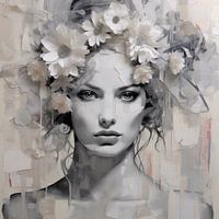 Zwartwit en naturel afbeelding van een portret van een vrouw. Romantisch en strak door het gebruik van organische vormen en strakke lijnen en vlakken. Realistisch vormgegeven bloemen die van het doek af lijken te komen. Kleurstelling wit, zwart, beige, lichtroze. Naturel, indringend en vol emotie. Mixed media.