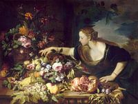 Vrouw neemt fruit uit een schaal met bloemen en vruchten, Abraham Brueghel (1669)