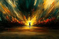 Dit kunstwerk straalt kracht en dynamiek uit. De vrouw lijkt op een iconische manier omringd door vurige kleuren, wat haar aanwezigheid versterkt in de dramatische scene. De abstracte opzet geeft de indruk van een explosie van energie en beweging, wat het kunstwerk zowel intens als expressief maakt. Dit ontwerp zou schitteren in elke ruimte die een krachtige emotie of energie uitdrukt. Perfect voor een ruimte die uitnodigt tot reflectie en vernieuwing, een element dat zowel warmte als abstractie uitstraalt. Het is een meesterwerk dat niet alleen de ruimte verfraait maar ook het gevoel van emotie en beweging versterkt.