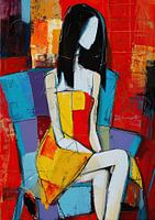 Vrouw op Stoel - Op dit vrouwen schilderij zie je een vrouw in een gele jurk, ontspannen zittend op een stoel, met een sterke achtergrond van rode en kleurrijke vlakken die de abstracte stijl benadrukken.