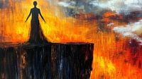 Schilderachtig tafereel van een vrouw die op een klif staat met haar armen uitgestrekt, kijkend naar een levendige, vurige zonsondergang met dramatische wolken. Het werk symboliseert moed, kwetsbaarheid en de onzekerheid van de toekomst.