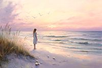 Een dromerig moment aan zee, vastgelegd in zachte pastelkleuren. Een jonge vrouw staat rustig op het strand terwijl de golven zachtjes beuken en de zon verlangend opkomt aan de horizon. Deze foto brengt rust en inspiratie in elke slaapkamer en verandert deze in een oase van ontspanning.