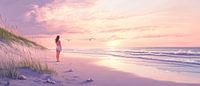 Zachte pastelkleuren versmelten met de zachte golven van de zee, terwijl een silhouet op het strand blijft hangen. De horizon, doordrenkt met een warm licht, straalt rust uit en nodigt je uit om te dromen. Dit betoverende schilderij brengt een ontspannen sfeer in elke slaapkamer, perfect voor momenten van contemplatie en ontspanning.