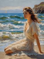 Een impressionistisch portret van een jonge vrouw zittend op het strand. Ze is in gedachten en geniet van haar uitzicht terwijl ze aandachtig luistert naar het rustgevende geluid van de zee en de golven.
