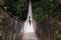 De foto toont een indrukwekkende hangbrug die door een weelderig groen bos loopt. De brug, gemaakt van houten planken met touwen als leuningen, reikt ver de verte in en wordt omringd door een dichte, natuurlijke begroeiing. Over de brug loopt een persoon van de camera weg, gekleed in een wit shirt, zwarte broek en roze…