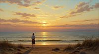 Een vrouw staat op een strand bij zonsondergang, met uitzicht op de oceaan. Warme kleuren domineren de scène.
