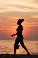Een jonge vrouw wandelt over het strand van Ifaty, Madagaskar bij zonsondergang. Het silhouet van de vrouw steekt af tegen de ondergaande zon en de oranje gekleurde horizon.