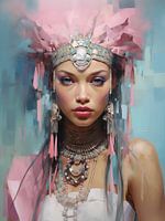 Portret van een prachtige vrouw in roze en aquablauw. Mooie diverse kettingen sieren haar hals evenals een schitterende hoofddoek en medaillon op haar hoofd met band. Haar kleding verdwijnt in de achtergrond. Dit geeft het een mooi artistiek effect. Passend bij diverse stijlen en trends.