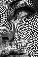 Een zwart en wit foto van het gezicht van een vrouw.