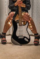 een vrouw met hoge hakken en een elektrische gitaar in een sensuele outfit