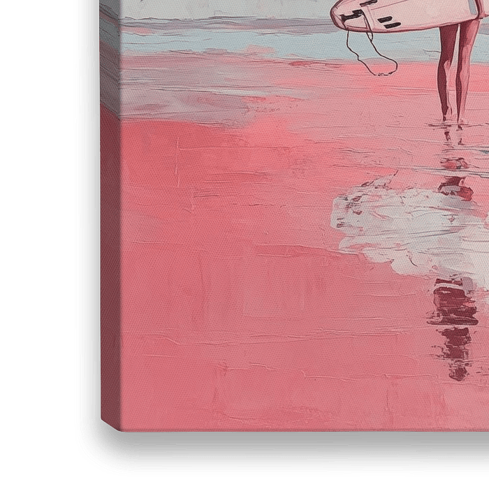 Vrouw surfer roze zonsondergang schilderij van een vrouwelijke surfer tegen een roze zonsondergang is een elegante en luxe toevoeging aan elke ruimte. De warme roze tinten van de zonsondergang in combinatie met de sierlijke houding van de surfer creëren een rustgevende en tegelijkertijd dynamische sfeer. Het minimalistische gebruik van kleuren voegt een verfijnde uitstraling toe die zich moeiteloos in verschillende interieurstijlen kan integreren, van modern tot klassiek.