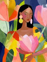 Een zelfverzekerde vrouw met lange zwarte haren staat omringd door grote, kleurrijke bloemen in warme en levendige tinten. Haar grote oorbellen en felgekleurde jurk versterken het speelse en expressieve karakter van het kunstwerk. Een moderne, energieke compositie die kracht en schoonheid viert.