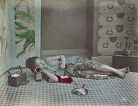 In haar hand houd de dame een traditionele Japanse pijp. Vooral het lichte blauw en rood springen uit de print.