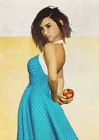 Deze charmante kunstschepping toont een jonge vrouw met een appel. Ze verbergt de appel achter haar rug, waardoor we ons afvragen wat ze van plan is. We kijken naar haar ogen. We bestuderen de manier waarop haar schitterende blauwe jurk midden in een soort beweging lijkt te zitten. Ze is een prachtige jonge vrouw die de volledige controle heeft over haar bestemming. Ze is opgewekt. Het lijdt geen twijfel dat degene die bij haar is waarschijnlijk ook goedgeorganiseerd is. Dit is een scène die je terug kan brengen naar de belangrijkste momenten van je jeugd.