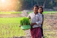 Twee vrouwen met rijstplanten in een rijstveld in Cambodja