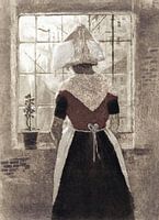 Aquarel van een Zeeuwse vrouw in klederdracht voor het raam.