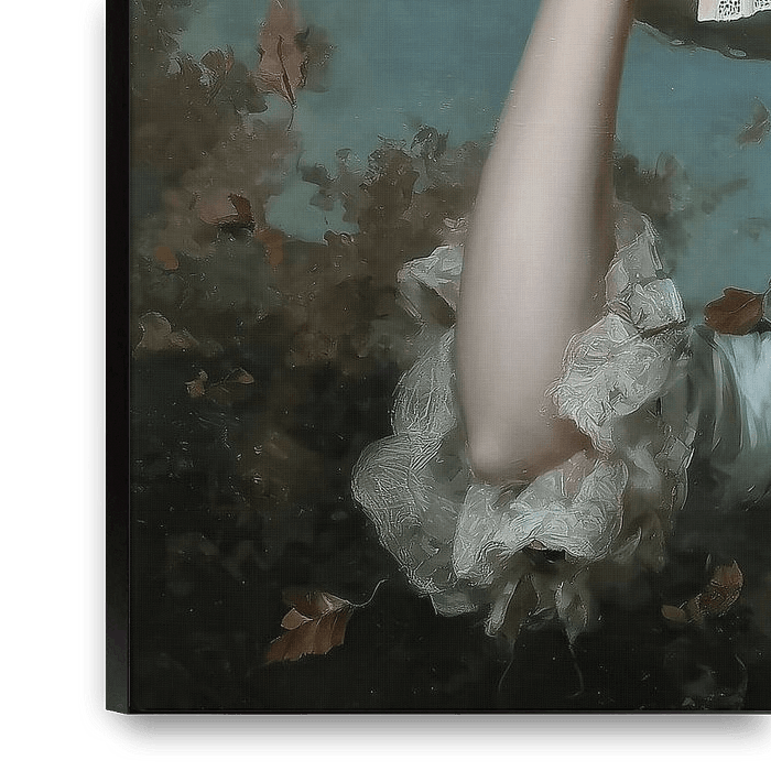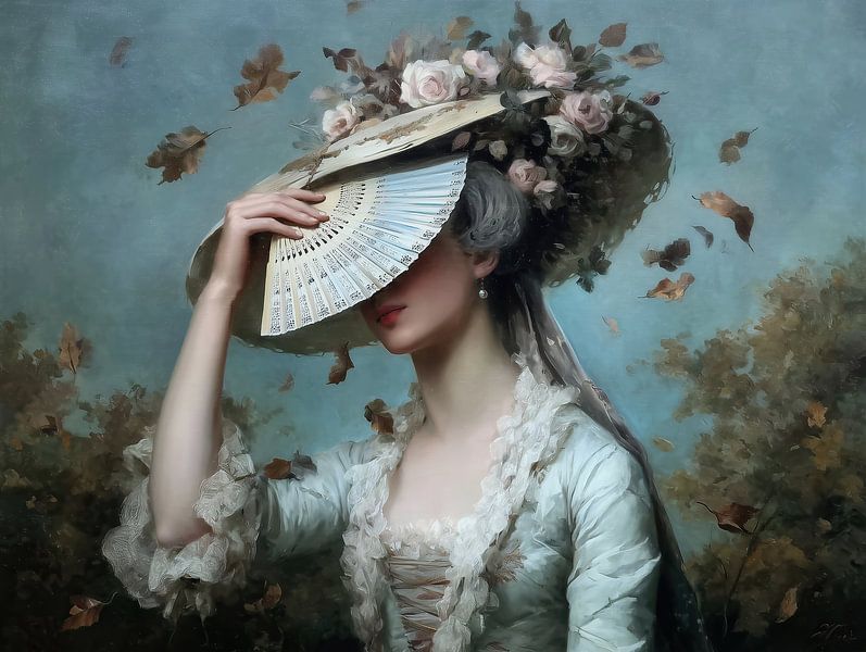 Techniek en materiaal zijn hoorbaar in het beeld: lagen verf die fris maar gecontroleerd zijn opgebouwd, dunne glacis over de huid en dikkere, bijna tastbare toetsen in de bloemen en bladeren. De jurk is geschilderd met een lichte penseelvoering, rimpels en kanten randjes zijn met een lichte, secuur geplaatste penseelstreek aangegeven. De vallende bladeren — bruin, licht gekruld — geven beweging en seizoensgevoel, alsof een late wind door het tafereel speelt. Je ziet dat er gewerkt is met ritme: herhaling van ronde vormen (hoed, rozen, waaier) tegenover de verticale hals en arm, waardoor het beeld rustig maar levendig blijft.