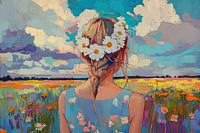 Vrouw - Meisje met bloemen. Panorama uitzicht meisje met bloemen. Impressionisme portret schilderij van vrouw bij een uitzicht op een landschap.