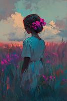 Vrouw - Uitzicht met bloemen. Panorama uitzicht meisje met bloemen. Impressionisme portret schilderij van vrouw bij een uitzicht op een landschap.