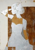Vrouw - Dit vrouwenschilderij toont een gestileerde vrouwelijke figuur in een elegant pose, uitgebeeld in monochrome witte en omringd door bruintinten, waarbij de aandacht gaat naar haar geprofileerde houding en de abstracte, rustieke textuur van haar omgeving.
