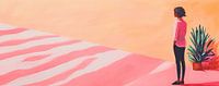 Vrouw - Op dit vrouwen schilderij zie je een vrouw in een roze omgeving met een plant, die een positieve en rustige sfeer uitstraalt.