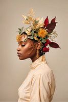 "Vrouwe Herfst in Profiel" is een serene viering van de herfst en de natuurlijke schoonheid die het seizoen met zich meebrengt. In dit fotografische portret zie je een jonge, negroïde vrouw in profiel tegen een achtergrond van warm lichtbruin. Haar jurk, een subtiele variant van de achtergrondkleur, voegt een laag van elegant minimalisme toe aan het stuk.