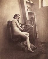 Deze hoek van een schildersatelier ergens in Frankrijk in het midden van de negentiende eeuw is nauwelijks aan tijd of plaats gebonden; het zou vandaag net zo goed een loft in New York kunnen zijn of, als fotografie vier eeuwen eerder had bestaan, een studio in de Italiaanse Renaissance. Wat hier verrassend is, is de afwezigheid van zelfs de dunste vermomming - geen volants van draperie, uitgebreid kapsel of strengen kralen zoals vaak wordt aangetroffen in het werk van andere leveranciers van 'studies voor kunstenaars'. Hier is het model volkomen naakt. Met haar intelligente hoofd en vuile voeten hielp deze jonge vrouw bij het oprichten van de nuchtere meisjesstudentenclub waar Édouard Manets Olympia tien jaar later bij kwam.
