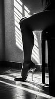 Deze elegante zwart-witfoto toont een vrouw op hoge hakken zittend op een stoel met haar benen sierlijk gekruist. Het licht dat door een raam naar binnen valt, creëert een betoverend patroon op de vloer en verlicht de scène met een stijlvolle esthetiek en een vleugje mysterie.