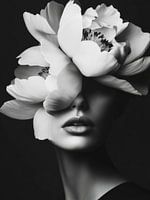 Een zwart-wit fotokunstwerk toont een jonge vrouw, deels verborgen achter een wolk van witte bloemen die zich zachtjes om haar gezicht draperen. Haar ogen zijn niet zichtbaar, alsof ze schuilgaan achter de delicate bloemen, wat een gevoel van mysterie en anonimiteit oproept. Alleen haar mond en neus komen naar voren, waarbij haar lippen subtiel op de voorgrond treden. De afwezigheid van haar blik versterkt de focus op haar sensuele gelaatstrekken en de organische lijnen van de bloemen.