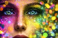 Close-up van het gezicht van een vrouw, versierd met levendige, glinsterende make-up in de kleuren van de regenboog. Dit beeld vangt de energie, vreugde en opwinding van de carnavalsvieringen en straalt feestelijkheid en levensvreugde uit.