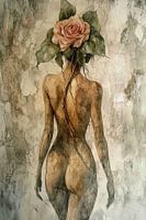 De vrouwelijke rug, zacht en krachtig tegelijk, loopt over in een roos die uit haar hoofd bloeit — een symbool voor groei, vrijheid en natuurlijke schoonheid. De verweerde achtergrond met kalkachtige texturen en aardse tinten versterkt het gevoel van tijdloosheid…