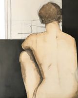 Vrouwelijk naakt in aardetinten. Weergave van een naakte vrouw, zittend op de rug gezien.