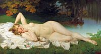 De jonge vrouw ligt verleidelijk en geheel bloot op dit kunstwerk in de vrije natuur op het gras met een laken. Achter de meid stroomt een rivier en de bladeren verraden dat het najaar is.