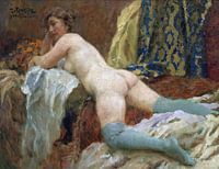 Dit naaktmodel poseert tussen zitten en liggen in op haar knieën. De vrouw is daarbij deels bloot aangezien zij slechts nylonkousen aan en haar bovenbenen, billen, rug, buik, schouders en een tiet zijn ontbloot in deze erotische pose.