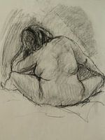 Naaktstudie, houtskooltekening op papier geschetst naar levend model. Zittend vrouwelijk naakt, op de rug gezien. Voluptueus model, Rubensvrouw.