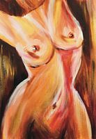 Gedurfde penseelstreken en warme kleuren creëren een abstracte weergave van de menselijke vrouwelijke vorm, die de essentie van beweging en emotie vastlegt. Het gebruik van licht en schaduw voegt diepte en dimensie toe aan het stuk. Weergeven wordt het naakte figuur van een vrouw met haar mooie rondingen gezien van haar volledige torso…