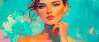 Met heldere kleuren en een expressief gezicht trekt deze moderne portretkunst ieders aandacht. De zachte penseelstreken omlijsten de contouren en geven de afbeelding een zekere elegantie. Dit kunstwerk is ideaal voor in de woonkamer, creëert een uitnodigende sfeer en zet aan tot nadenken en dromen.